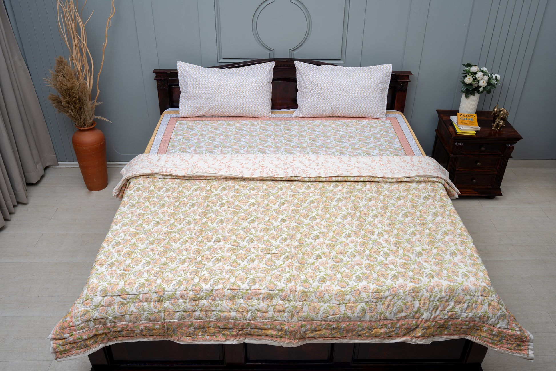 Curated with exquisite craftsmanship, this Reversible cotton quilt is ideal for the seasons of autumn, winter, and early spring. Lay out this hand blocked and hand quilted quilt to remain snug and also to accentuate the decor of your room.