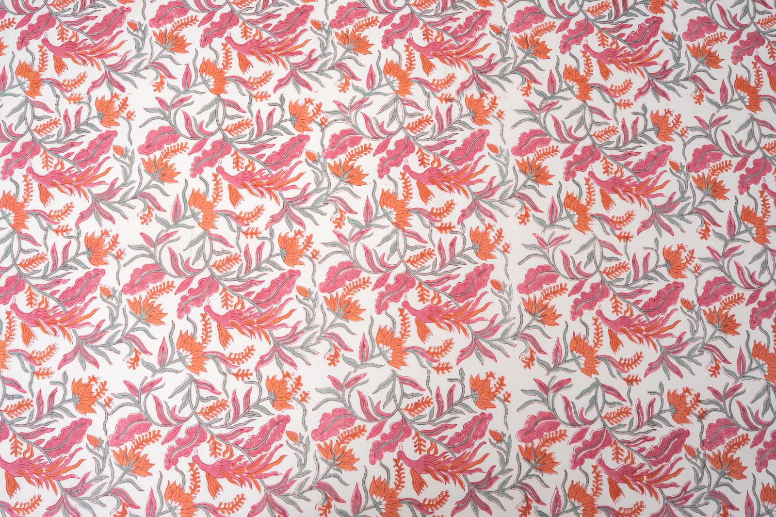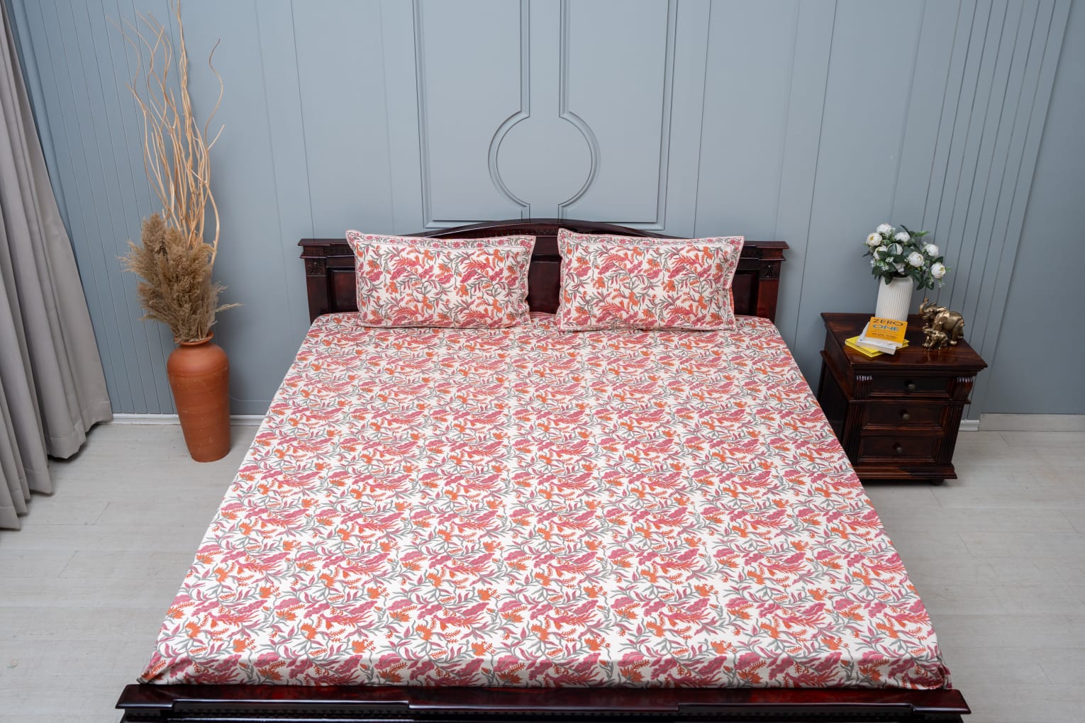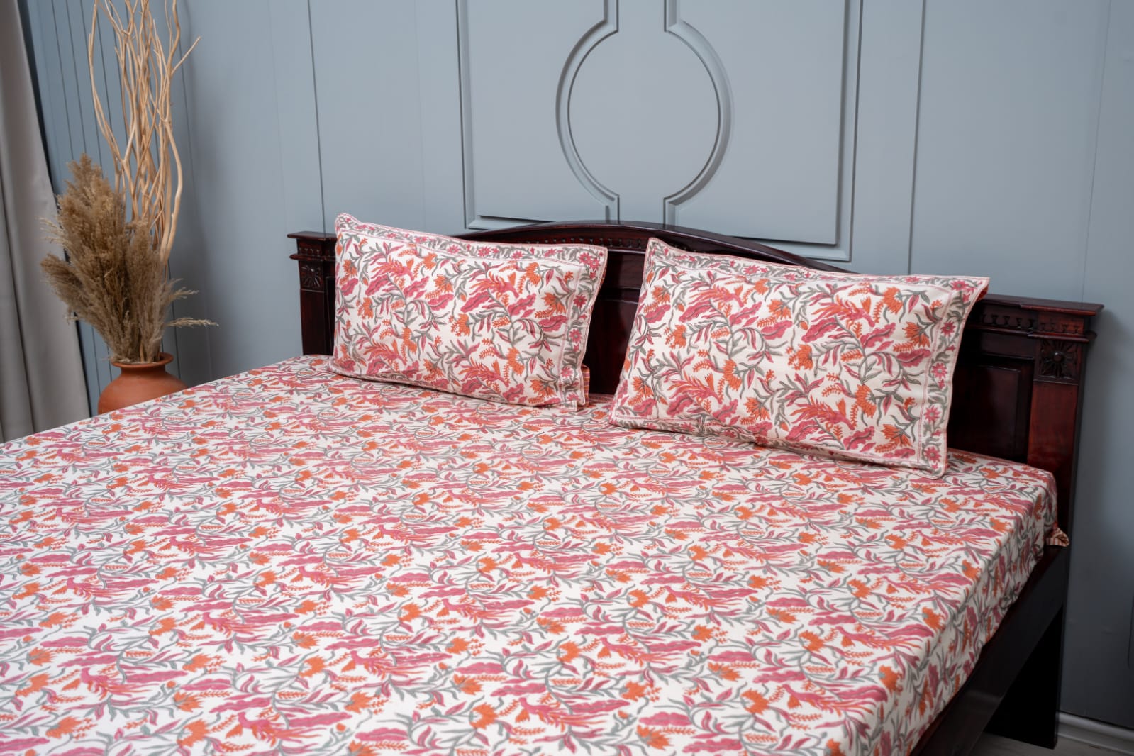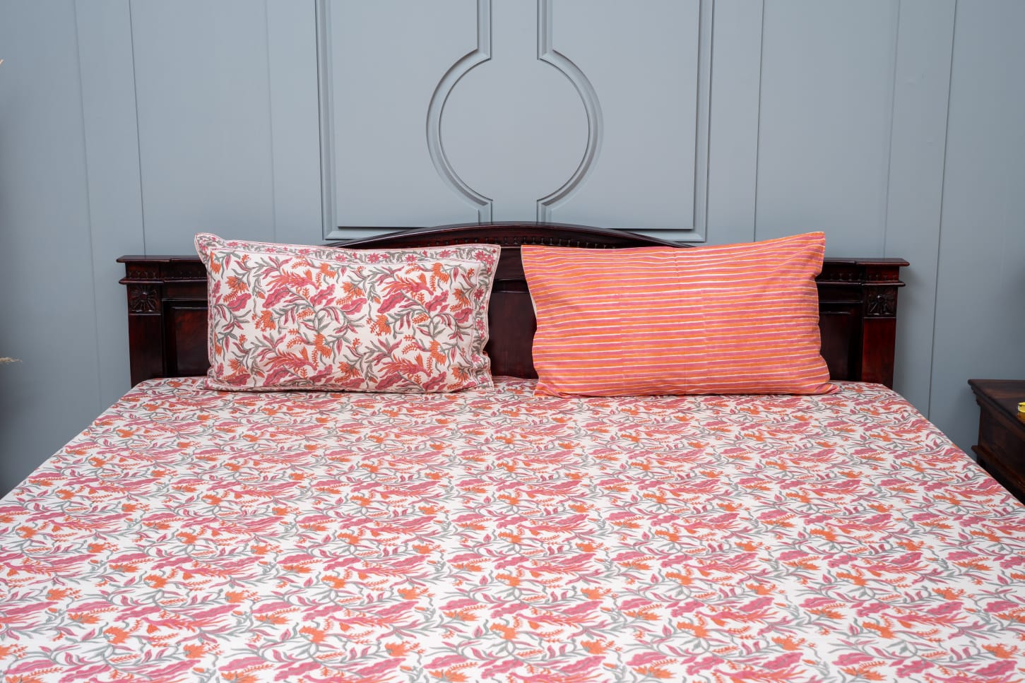 This cotton bedsheet is made using traditional hand block printing with intricate floral motifs, finished off with light stripes on the sides for a contemporary touch